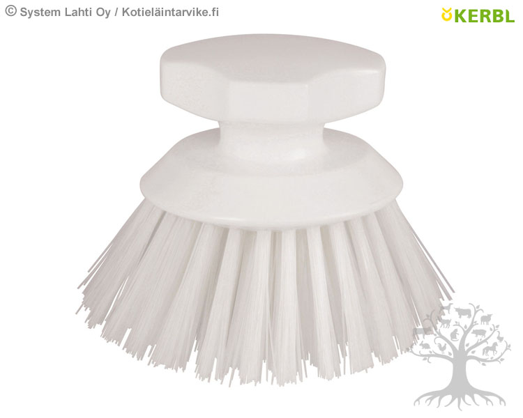 Kerbl Washing Brush Round, White. Round scrub brush with a diameter of 120 mm. The bristles are made of polyester. The scrub brush can be cleaned by boiling. The brush has a shaped handle. White bristles. Suitable for hygienic areas (HACCP).