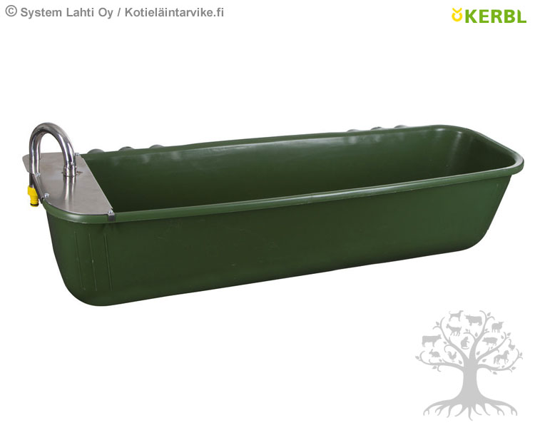 Kerbl Water Trough 42L with Float Valve. Simple water source for animals without installation work, just connect the water hose to the garden hose quick connector. The float valve can be used at both ends of the trough. Capacity 42l. The tube and the float lid are made of stainless steel. The trough is made of fiberglass reinforced plastic. Mounting width 50mm. Dimensions (W x D x H) 100cm x 35cm x 24cm.