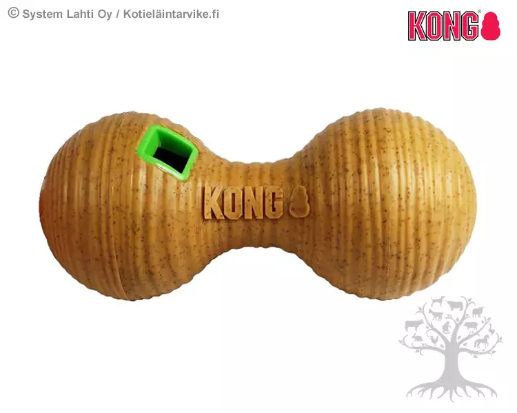 Kong Aktivointilelu Bamboo Feeder Dumbbell. Täyttämällä Bamboo Feeder Dumbbell lelu herkuilla innostaa se koiraa pyörittämään ja heittelemään lelua saadakseen herkut ulos. Dumbbell toimii loistavasti paitsi aktivointileluna, myös vaikka ruoka-annostelijana. Kong Dumbbell on helppo täyttää ja käyttää - lelu vain kierretään auki, täytetään herkuilla tai nappuloilla ja kierretään takaisin kiinni. Materiaalina bambu vaimentaa melua ja tekee leikkihetkestä hiljaisemman.
