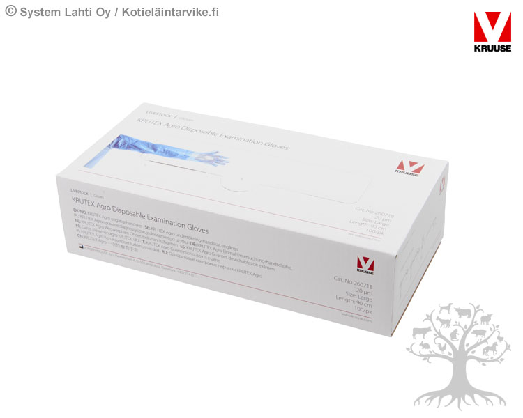 Kruuse Examination Gloves Krutex Agro 100pcs. Examination glove for example calving, farrowing, foaling and artificial insemination. Good sensitivity. The disposable examination glove is blue. Cut diagonally for better fit. Glove is 90cm long. Thickness 20 mµ. Made of durable 100% polyethylene. Size: Large. Packing size 100 pcs.
