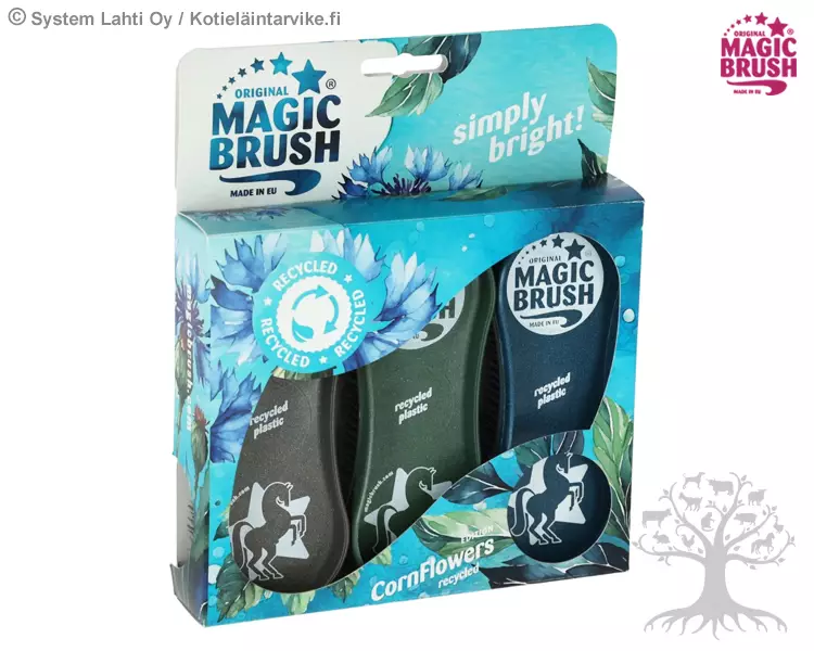 MagicBrush Brush Set CornFlowers. For more sustainability in the cleaning box: The MagicBrush Set Cornflowers in trendy shades is made from recycled PE. To do this, used plastic packaging is separated and ground into granules. This is the starter material for new plastic products - such as the MagicBrush Cornflowers Recycled.The special structure and shape of the MagicBrush Quadro bristle cleans particularly effectively and provides a pleasant massage effect.