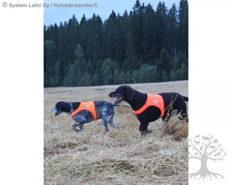Mummadesign Soma Huomioliivi 2-Värinen. Hyvin istuva perushuomioliivi. Liivi sopii erinomaisesti metsästyskoirille sekä pimeän aikaan lenkkeileville koirille. Rinnanympärys kiinnitetään leveällä tarranauhalla.