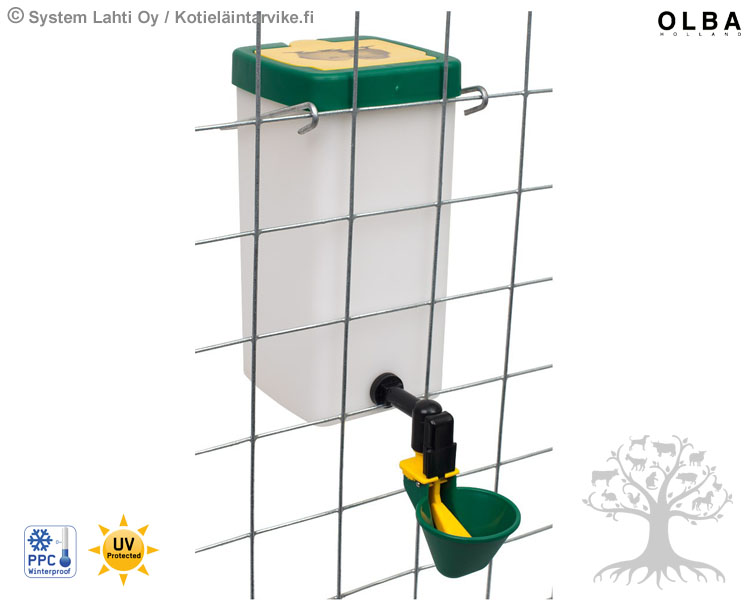Olba Drinking Bottle 1L with Drinking Cup. Drinking bottle is suitable for chickens and other poultry thanks to the innovative large drinking cup. These larger cups operate with a float; the seamless drinking cup is filled with water and as soon as the float starts floating, the water supply is closed. This way the animals will always have sufficient drinking water. With the standard galvanized mounting bracket the drinking bottle can be assembled to almost every accomodation in the blink of an eye. This guaranteed leak-free solution keeps the litter clean and dry. Drinking Bottle is easy to refill within the accomodation, thanks to hinged cover. Frost resistant PPC plastic. Very easy to clean due to seamless design drinking cup.