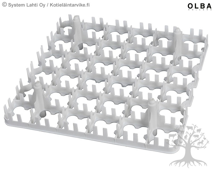 Olba Egg Tray 36 White. Egg tray for 306chicken eggs. Color: White. Dimensions: 28,7cm x28,7xm. Maximum egg size 47mm. Easy to use, stack and clean. The egg tray is made of durable and sturdy plastic.