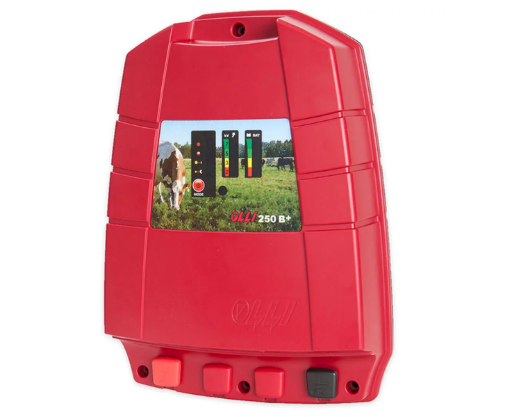 Olli 250B+ features include an informative LED display, monitoring of fence condition, battery voltage indication, selectable battery deep discharge protection, and four power saving modes: