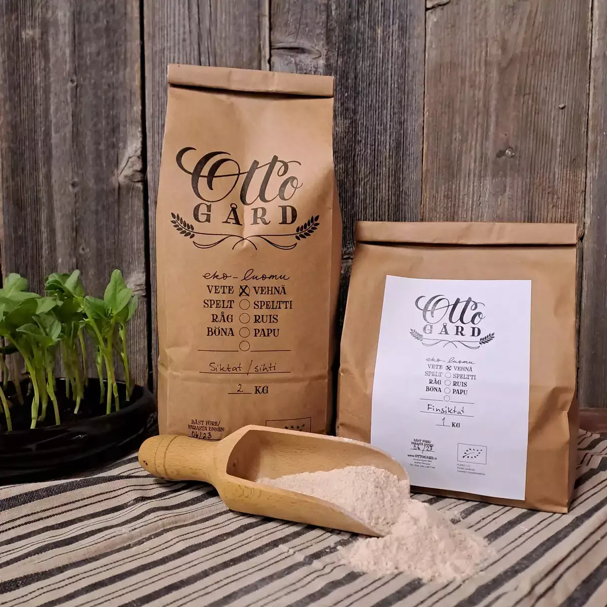 Otto Gård Vehnä Sihtijauho Luomu. Täysjyväjauho, josta karkeimmat osat ja leseet on seulottu pois.
