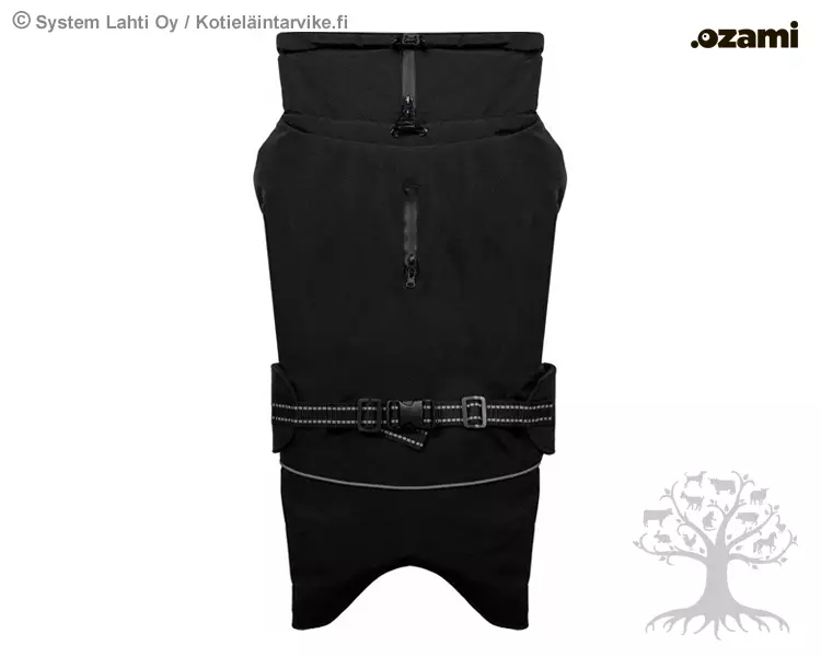 Ozami Toppamanteli Black. Tämä vettä hylkivä talvitakki on suunniteltu pitämään koirasi lämpimänä ja kuivana kylmissä ja kosteissa olosuhteissa. Täysin teipatut saumat ja fleecevuori tarjoavat sekä suojaa että eristystä. Erittäin paksu puuvillatäyte lisää lämpöä, ja hengittävä kangas varmistaa, että kosteus haihtuu. Joustava kangas kaulan alueella parantaa mukavuutta ja istuvuutta. Takissa on säädettävä heijastinnauha napsautus soljella ja heijastinnauhat, jotka lisäävät turvallisuutta pimeässä. Kaksi vedenpitävää vetoketjua helpottavat taluttimen kiinnittämistä pantaan tai valjaisiin. Kestävästä kolmen kerroksen kuorikankaasta valmistettu takki tarjoaa täydellisen yhdistelmän toiminnallisuutta ja tyyliä.