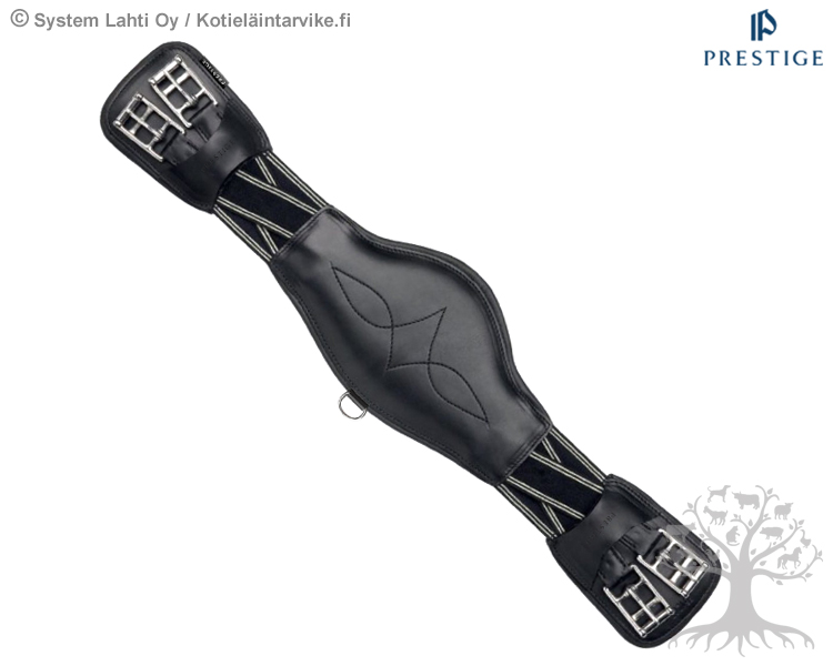 Prestige Koulusatulavyö Dressage Elastic 3A043. Erittäin laadukas joustollinen koulusatulavyö, joka antaa hevoselle erinomaisen liikkumavapauden. Sisäpuolen vuorinahan alla on pehmeä painetta tasaava täyte. Nahasta valmistetun vyön molemmissa päissä on napakat/vahvat ristiinmenevät joustot sekä rollerisoljet. Vyössä on myös D-rengas, johon voi halutessaan kiinnittää esimerkiksi apuohjat.