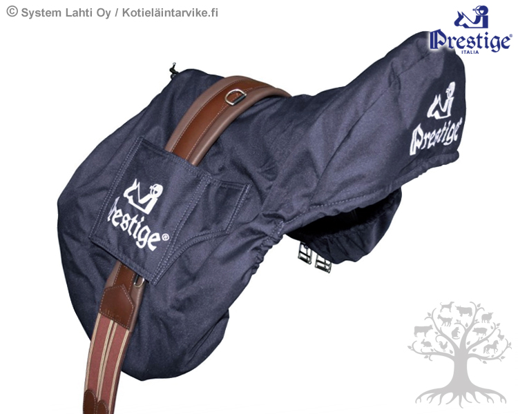 Prestige Saddle Cover Jump Marin. A top quality saddle cover for jump saddles that really protects the saddle from damage, dirt and moisture. Made from thick, waterproof fabric with a soft fleece inner lining. On both sides of the saddle cover there are "protection pockets" for the buckle heads of the saddle girth (see picture). Keeping the saddle girth over the saddle cover keeps the saddle clean and prevents it from chafing. The saddle cover protects the back of the saddle all the way down. We recommend!