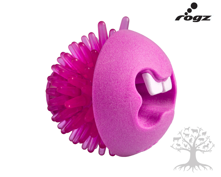 Rogz Aktivointilelu Fred Treatball Rosa. Erittäin laadukas, joustava ja pomppiva koiran aktivointilelupallo, jonka sisälle voidaan kätkeä herkkuja. Lelussa on pehmeitä kumisia nystyröitä, jotka putsaavat ja hierovat koiran hampaita ja ikeniä. Pallossa on hauska luunmuotoinen reikä, jonne voidaan kätkeä koiraa aktivoivia herkkuja. Ainutlaatuisen muodon ansiosta lelulla on arvaamaton liike ja pomppu, joka pitää koirat aktiivisena. Koirat tykkäävät pureksia pehmeää, mutta kestävää kumilelua, ja pyöritellä ja heitellä sitä saadakseen herkut sisältä. Lelu on hiljainen pehmeän kumimateriaalin ansiosta. Pallon halkaisija 6,4cm.