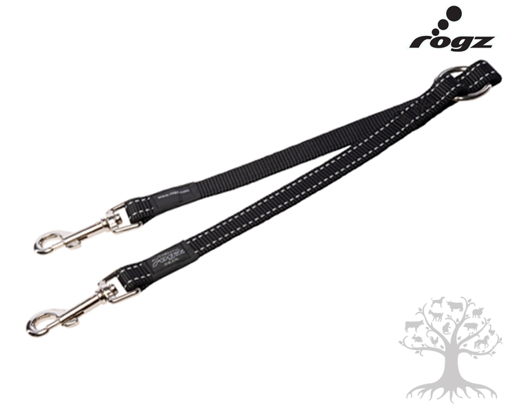 Rogz Taluttimen Jakaja Utility Double Split. Erittäin korkealaatuinen ja käytännöllinen taluttimen jakaja, joka on valmistettu pehmeästä ja miellyttävän tuntuisesta nailonista. Jakajan molemmissa päissä on pistoolilukot ja keskellä O-rengas, jotka mahdollistavat yhden taluttimen käytön kahden koiran kanssa. Taluttimen jakajassa on lisäksi heijastinpunokset, jotka takaavat näkyvyyden myös pimeään aikaan. Kiinnitä jakajan pistoolilukot koirien pantoihin tai valjaisiin ja taluttimen lukko jakajan O-renkaaseen (katso kuva).