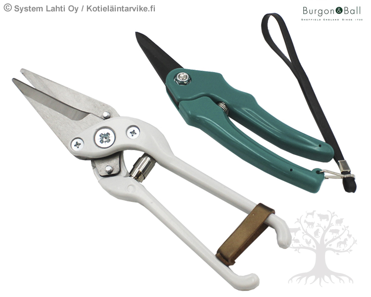 Sorkkasakset Professional & Supersharp. Sopivat lampaiden ja vuohien sorkkien leikkaamiseen. Pakkaukseen kuuluu kahdet sorkkasakset, joista toiset sopivat sorkkien lyhentämiseen ja toiset muotoiluun. Valkokahvaiset Professional sorkkasakset on tarkoitettu sorkkien lyhentämiseen. Sorkkasakset on kestävät ja kevyet, joissa on pulverimaalatut teräskahvat. Sorkkasaksissa on hiiliteräs terät. Terät on karkaistu kestäväksi. Sorkkasaksien alaterässä on sahalaita. Sorkkien muotoiluun sopivat Supersharp sorkkasakset ovat pienemmät ja vihreäkahvaiset. Hiiliteräs terät on lämpökäsitelty kestämään. Sopivat hyvin tarkkaan työskentelyyn. Terien jännite on säädettävissä. Sorkkasaksissa on yksinkertainen ja helppo terälukko. Sorkkasaksien kahva valmistettu hartsista ja kestävät kovaa kulutusta. Erinomainen muotoilu pitkäkestoiseen työskentelyyn. Kätevä käsihihna. Pakkaus sisältää kahdet sorkkasakset.
