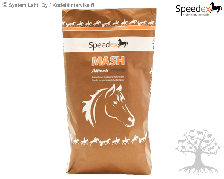 Speedex Suolistoystävällinen Mash 20kg. Speedex Mash on uusi erittäin hyvin maistuva, jauheinen ja helposti sulava mash -täydennysrehu, jossa on alhainen sokeri- tärkkelyspitoisuus. Mash koostuu kuitupitoisista raaka-aineista, kuten vehnäleseestä, viherjauhosta ja pellavarouheesta, jotka ylläpitävät suoliston toimintaa. Pellavarouhe tuo ruokintaan tärkeitä rasvahappoja. Speedex Mash sisältää höyrykypsennettyä ohraa, joka on helposti sulava energianlähde ja edesauttaa palautumista. Mukana myös Bio-Mos® vahvistamassa hevosen vastustuskykyä.