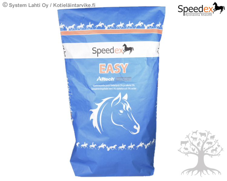 Speedex Täydennysrehu Easy 25kg. Vain vähän sokeria (5%) ja tärkkelystä (5%) sisältävä Speedex Easy on kuitupitoisista raaka-aineista koottu täydennysrehu, joka monipuolistaa karkearehuvaltaista ruokintaa. Viherjauho, melassileike sekä kaurankuorijauho ja vehnälese ovat hevosille maittavia ja mikrobeille helposti sulatettavia rehuja. Valmistettu Suomessa.