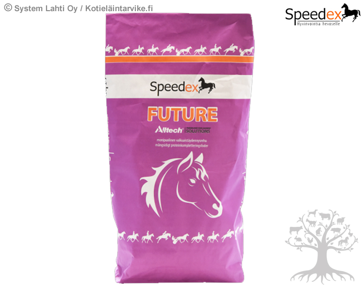 Speedex Valkuaistäydennysrehu Future 25kg. Speedex Future on monipuolinen ja kotimainen valkuaistäydennysrehu, joka on tarkoitettu kasvaville, nuorille hevosille, kantaville ja imettäville tammoille ja lihaksia kasvattaville, valmennuksessa oleville hevosille. Se sopii kaikille hevosille valkuaisköyhän karkearehun täydennykseen. Valmistettu Suomessa.
