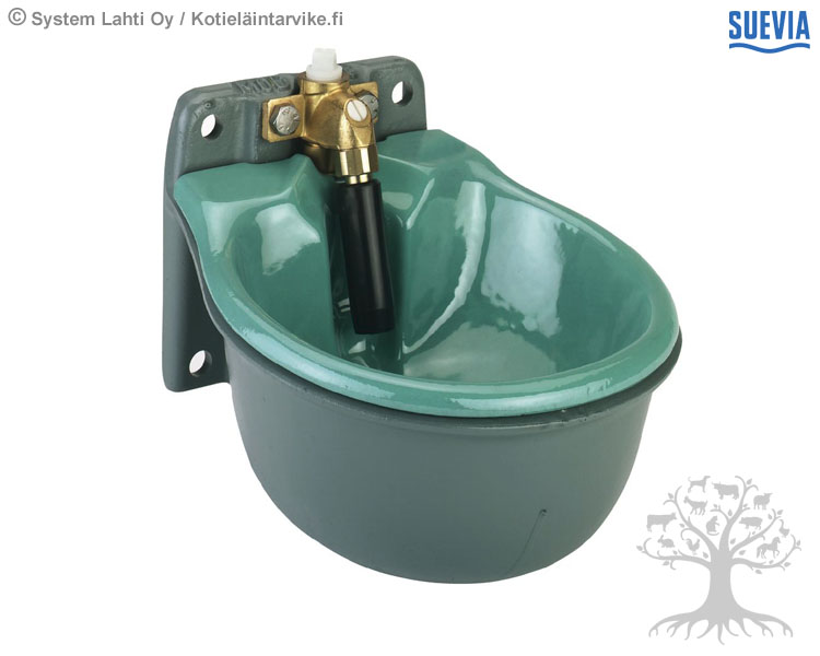 Suevia Heatable Drinking Bowl 46. Heatable drinking bowl with robust pipe valve. Bowl is made from cast iron and it is completely enamelled. Water flow continuously adjustable from the outside without disassembling the valve. Frost-protected down to approx. -15 °C. For wall and pipe mounting. Water connection 1/2" from above or below. Heating output 80W/24V. Dimensions: 18cm x 28.5cm x 21cm. Color: Green.