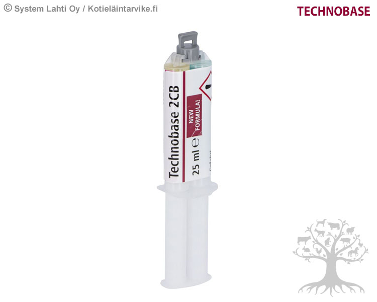 Technobase Adhesive 2CB 25ml. Technobase 2CB is a two-part adhesive for professional use. The blue colouring immediately indicates the correct mixture when the glue is squeezed out of the cartridge. The new recipe is optimized for setting time, viscosity and hardness parameters after polymerization. The glue becomes as hard as glass, which sticks optimally to the hoof and shoe. The liquidity of the adhesive mixture is designed so that it can work at both 45 ° and 90 ° angles. The hoof can bear full weight again after about 3 minutes. Bonds powerfully and permanently to wood and rubber blocks. For anyone who does not want to use large cartridges due to the small amount of adhesive required, the single-use cartridges offer the ideal alternative with their content of 25 ml.