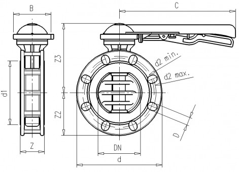 Perhosventtiilin mitat (katso mittatiedot kuvasta):