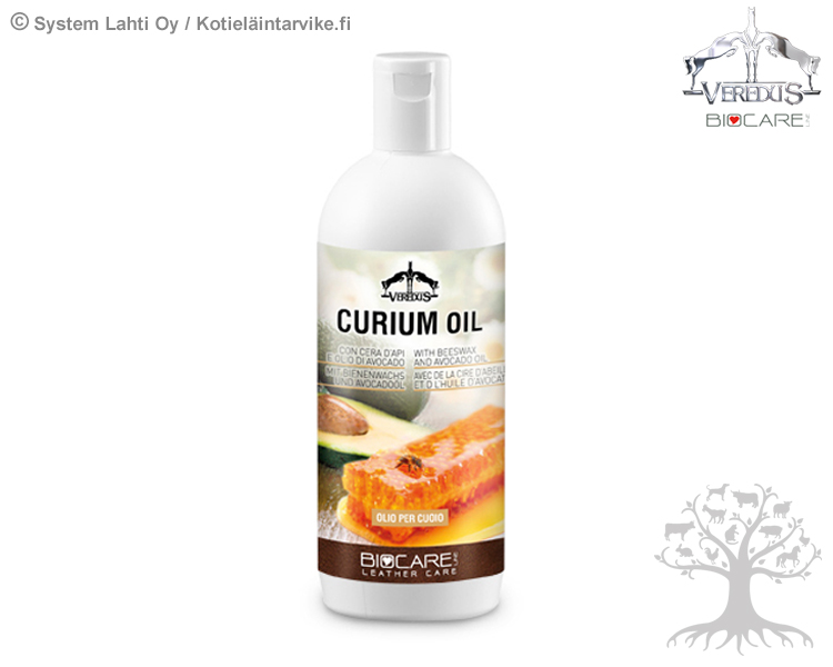 Veredus Leather Curium Oil. Horse leather oil with beeswax and avocado oil. Nourishing and softening oil for horse leather. It has cleaning and softening components that penetrate the leather and make it soft and waterproof. The wax forms a protective film against corrosive agents. Avocado oil and fatty acids nourish the leather deeply, keeping it smooth and resistant.