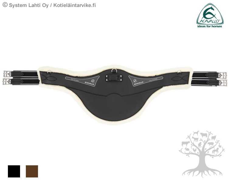 Acavallo Panssarivyö Comfort Gel Eco Wool. Erittäin laadukas Acavallon anatomisesti muotoiltu, geelillä ja synteettisellä lampaankarvalla pehmustettu panssarisatulavyö. Geelipehmustettu panssarisatulavyö sallii hevosen hengittää vapaammin sekä antaa hevoselle enemmän liikkumavapautta sekä suojaa hevosta iskuilta hevosen nostaessa hypyissä etujalkojaan. Geeli satulavyön sisäpinnassa hevosen herkimmillä alueilla pehmentää hevoseen kohdistuvaa satulavyön aiheuttamaa painetta, hikoilua ja puristusta sekä pitää vyön ja satulan hyvin paikoillaan ja oikeassa asennossa. Lampaankarvaa jäljittelevä synteettinen kuitu tekee satulavyöstä vieläkin pehmeämmän ja miellyttävämmän, joten se sopii erinomaisesti herkille hevosille. Lampaankarvaa jäljittelevä synteettinen kuitupehmuste on kiinnitetty vahvalla tarranauhalla eli se on mahdollista irrottaa esimerkiksi pesua varten.