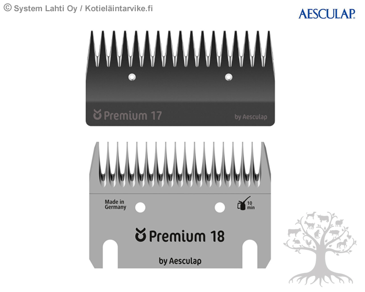 Aesculap Teräsarja Premium 18/17 teeth. Karvaleikkurin teräsarja sopii paksu ja tiheä karvaisille naudoille tai ohutvillaiselle lampaalle. Leikkauspituus 2-4mm. Yläterä 17teeth ja Alaterä 18teeth. Soveltuu karvaleikkureihin Constanta, FarmClipper, Heiniger, Aesculap ja Lister-Liscop. Valmistettu Saksassa. Valmistaja Aesculap.