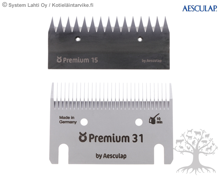Aesculap Teräsarja Premium 31/15 teeth. Karvaleikkurin teräsarja sopii sekä hevoselle että naudalla puhtaan tai hieman likaisen karvan leikkaamiseen. Leikkauspituus 2-4mm. Yläterä 15teeth ja Alaterä 31teeth. Soveltuu karvaleikkureihin Constanta, FarmClipper, Heiniger, Aesculap ja Lister-Liscop. Valmistettu Saksassa. Valmistaja Aesculap.