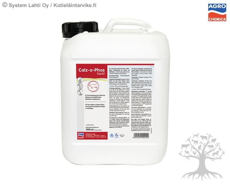 Agro Chemica Kalsiumlisä Calz-o-Phos Lehmille 5000ml. Nestemäinen suun kautta annettava kalsium -ja fosforilisä lehmille poikimisen yhteydessä veren kalsiumpitoisuuden nostamiseen. Suositellaan käytettäväksi korkeatuottoisille lehmille ja lehmille, joilla on riski sairastua poikimahalvaukseen poikimisen yhteydessä. Ei vahingoita limakalvoja ja imeytyy helposti. Ei sisällä syövyttäviä kalsiumklorideja.