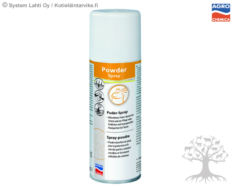 Agro Chemica Puuterispray Powder Spray 400ml. Hienojakoinen puuterispray, joka suojaa ja hoitaa herkkää ja stressaavaa ihoa esim. jalkojen välinen alue. Tukee turkin ja ihon luonnollista uudistusta. Puuterispray kuivattaa tehokkaasti hoidettavan ihoalueen. Ei sisällä antibiootteja. Ei dokumentointivaatimuksia.