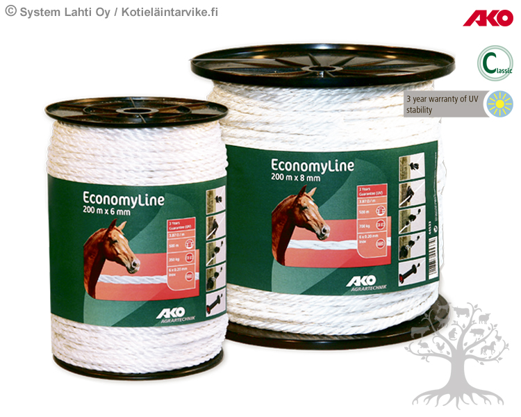 AKO Aitaköysi EconomyLine. AKO EconomiLine -aitaköydet on ihanteellinen vaihtoehto lyhyille aitauksille. Aitaköydessä on ruostumattomat teräsjohtimet, joissa on hyvä sähkön johtamiskyky. EconomyLine aitaköysillä on 3 vuoden UV-takuu.