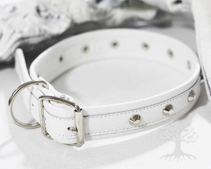 Arli Koristeniittipanta, valkoinen. Näyttävä koristeniittipanta koirille. Kotimainen ja laadukas, panta on valmistettu 100% suomalaisesta nahasta. Pannassa on sisällä venymätön kudos, jonka ansiosta nahka pysyy hyvin kuosissaan eikä pääse venymään. Pantakilpi nimen kaivertamista varten. Väri: valkoinen. Kotimaista käsityötä!