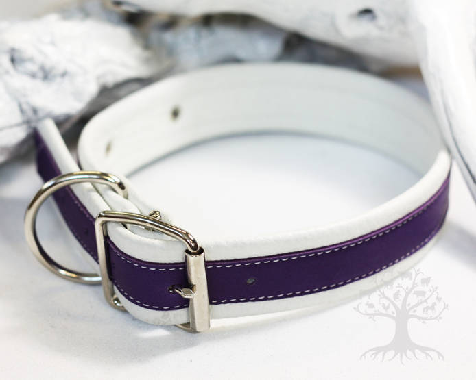 Arli Nahkapanta leveä, valkoinen/violetti. Laadukas leveä nahkapanta koirille. Kotimainen ja laadukas, panta on valmistettu 100% suomalaisesta nahasta. Pannassa on sisällä venymätön kudos, jonka ansiosta nahka pysyy hyvin kuosissaan eikä pääse venymään. Pantakilpi nimen kaivertamista varten. Väri: valkoinen / violetti. Kotimaista käsityötä!