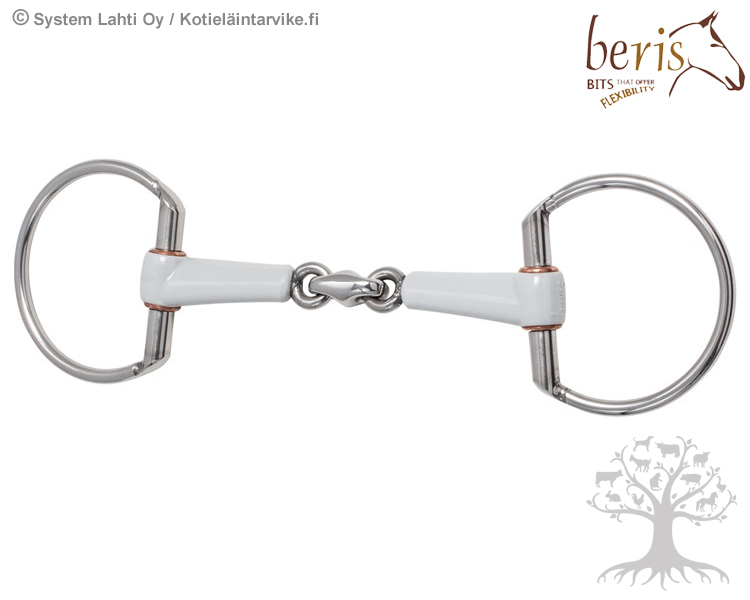 Beris Eggbutt Double Jointed. Beris Double Jointed 3-palakuolaimessa on teräsrunko, joka on päällystetty keskikovalla (medium) ja turvallisella elintarvikemuovilla. Kuolaimen keskipala on ruostumatonta terästä. Suuosa on muotoiltu ja litistetty (ohut ja leveä kosketuspinta) niin, että se jakaa hevosen kieleen ja hammaslomaan kohdistuvan paineen tavanomaista tasaisemmin. Keskiosaan päin matalat ja loivasti nousevat sivunivelet antavat hieman tilaa myös kielelle. Lisäksi kuolaimessa mahdollisimman pienet nivelliitokset (nivelrenkaat), jotka osaltaan vähentävät hevosen suuhun kohdistuvaa painetta.