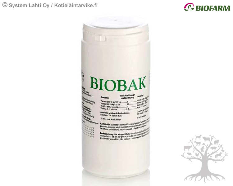 Biofarm Maitohappobakteerivalmiste Biobak 1kg. Maitohappobakteerijauhe suoliston normaaliflooran ylläpitoon. Maitohappobakteeria sisältävä täydennysrehu kotieläimille, porsaille ja vasikoille. Sen käyttö on perusteltua ripulin yhteydessä, tukihoitona elektrolyyttihoidon yhteydessä, aina antibioottikäsittelyn kanssa tukihoitona, suolistohäiriöiden ennaltaehkäisyyn, vierotuksen, eläinvälityksen, kuljetuksen ja matkustamisen sekä ruokinnan muutoksien aikana.