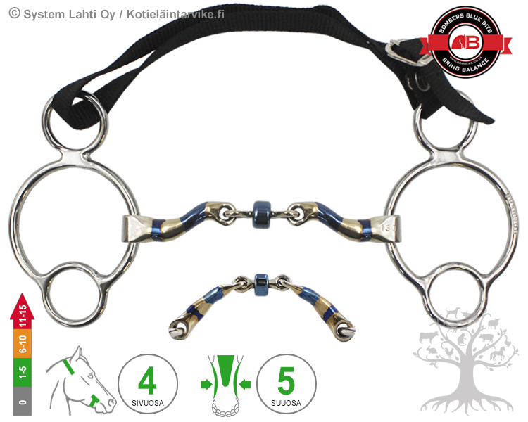 SIVUOSA - 2½ -ring on vapaasti pyörivä monirenkainen kuolainrengas, jossa on ylä- ja alapuoliset "lisärenkaat" sekä leukahihna. Ylimmistä renkaista kuolain kiinnitetään poskihihnoihin ja keski- ja/tai alarenkaisiin kiinnitetään yhdet tai kahdet ohjat tarpeen mukaan. Kuolaimen vipuvaikutus määräytyy sen mukaan, mihin renkaisiin ohjat kiinnitetään, isoimmissa renkaissa kuolaimen vipuvaikutus on pehmein ja alimmissa renkaissa voimakkain. Kuolaimen ylimmissä renkaissa on leukahihna, jolla säädetään kuolaimen vipuvaikutusta sekä alaleukaan kohdistuvaa painetta. Leukahihna säädetään niin, että kuolaimen vipukulma on noin 45° kulmassa (älä kiristä liian tiukalle). Vapaasti pyörivässä kuolainrenkaassa kuolaimen suuosa pääsee liukumaan helposti ja nopeasti, joten ratsastajan ohjasavut siirtyvät ja vapautuvat kuolaimen suuosaan kiinteää kuolainrengasta huomattavasti nopeammin. Lisäksi 2½ -renkaisessa sivuosassa on myös sivuittaissuuntaista (cheek) ohjaavaa vaikutusta. 2½ -renkainen on todella monipuolinen kuolainrengas ja sen vipuvaikutuksia voidaan säätää helposti ja nopeasti tarpeen ja tilanteen mukaan. Sisältää säädettävän nylonisen leukahihnat, jossa on kätevä nepparikiinnitys.