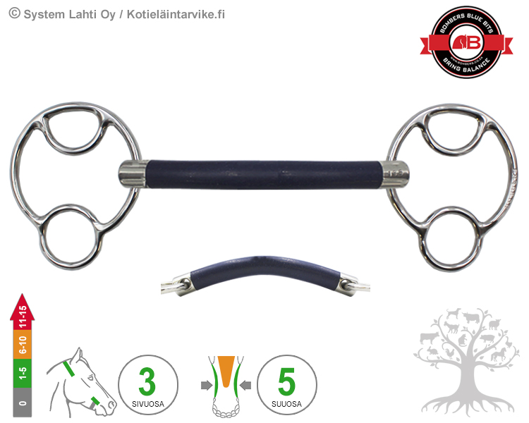 Bombers 2½ -ring Miia Bomber Blue Mullen. Bomber Blue Mullen on valmistettu ainutlaatuisesta, kevyestä ja lämpimän tuntuisesta sekä erittäin hyvin sylkeä/limaa stimuloivasta nailonkomposiitista (sisällä on teräsvahvike). Kuolaimen ainutlaatuinen materiaali sopii erityisesti hevosille, jotka vastustavat metallista valmistettuja kuolaimia mm. pelaamalla kuolaimella ja/tai olemalla suustaan hyvin levottomia. Loivaan kaareen muotoillun Bomber Blue Mullen kuolaimen vaikutukset kohdistuvat tasaisesti koko suun alueelle ja erityisesti hevosen kielelle. Kieleen kohdistuvalla paineella on hevosen päätä laskeva vaikutus. Mullen on vaikutuksiltaan vahva kuolain, joten se ei sovellu nuorille hevosille eikä kokemattomille ratsastajille. Bomber Blue Mullen on materiaalinsa vuoksi pehmeämpi vaihtoehto kuin vastaava Sweet Ironista valmistettu Mullen. Kuolaimissa on mukana Bombersille tunnusomaiset oranssit väriset kuolaintutit, jotka voi halutessaan ottaa pois.