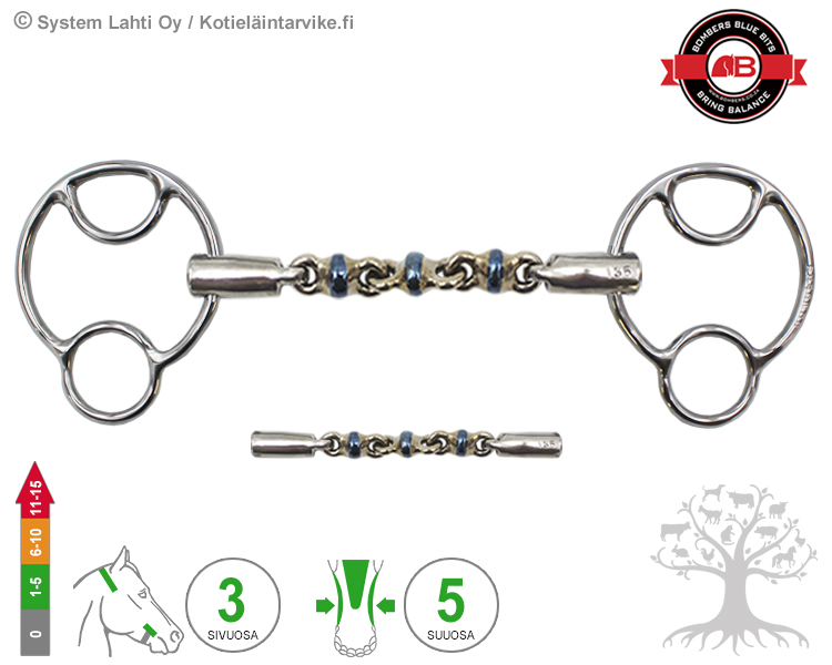 Bombers 2½ -ring Miia Waterford. Waterford on 5-palainen ketjukuolain, joka jakaa kielelle ja hammaslomaan kohdistuvan paineen ja puristuksen erittäin tasaisesti. Waterford kuolaimen nivelletyt palat ovat pyöreän muotoisia, joten ne aiheuttavat tasaisin välein hieman pistemäisiä painekohtia hevosen kieltä ja kitalakea vasten. Vaikutuksiltaan pehmeä ja hevosen suuta myötäilevä kuolain rohkaisee hevosta tukeutumaan paremmin kuolaintuntumalle. Waterford kuolaimissa suositellaan käytettävän “normaalimittaa” 10mm pidempää kuolainta, että taipuisa “ketjukuolain” pääsee muotoutumaan paremmin hevosen suun myötäisesti. Pidempi kuolain maksimoi myös kuolaimen vaikutuksen. Kuolaimen suuosa on valmistettu Bombersin kehittämästä, ainutlaatuisesta ja erittäin hyvin sylkeä stimuloivasta makeasta raudasta eli "Sweet Iron" -metalliseoksesta.