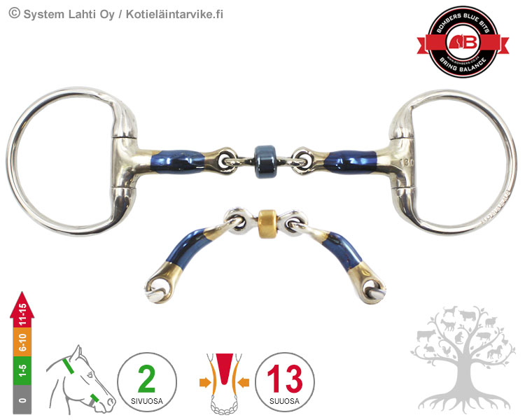 SIVUOSA - Bridong Eggbutt on pienirenkainen (bridong) ja kiinteä (eggbutt, oliivirengas) kuolainrengas, jota yleisemmin käytetään yhdessä kankikuolainten kanssa. Kiinteä kuolainrengas vapauttaa suuosan ohjastuntumalta hitaammin kuin vapaasti pyörivä kuolainrengas (Loose Ring), joten se tehostaa kuolaimen suuosan vaikutusta ja aiheuttaa hieman hevosen niskaan (poll) kohdistuvaa painetta/vipuvaikutusta. Lisäksi kiinteällä kuolainrenkaalla on myös sivuittaissuuntaista (cheek) ohjaavaa vaikutusta. Kuolaimen muotoilu estää kuolainrengasta työntymästä hevosen suuhun ja nipistämästä hevosen suupieliä. Kuolainrenkaan koko on noin 57x50mm (korkeus x leveys) pituuksille 90-115mm ja noin 67x63mm pituuksille 120-160mm. Kuolainrenkaan kokoa voi halutessaan vaihtaa pituuksille 90-115mm koosta 57x50mm kokoon 67x63mm, mutta siitä tulee ilmoittaa tilauksen yhteydessä erikseen.