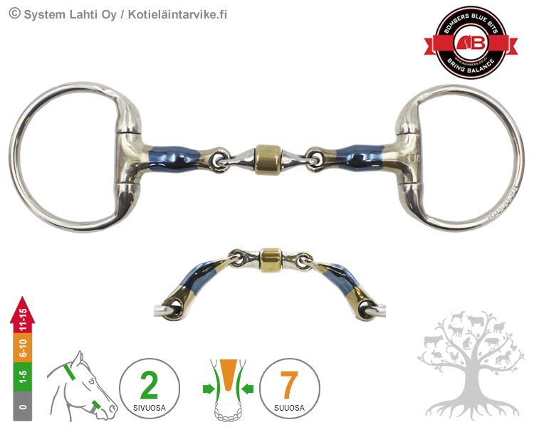 SIVUOSA - Bridong Eggbutt on pienirenkainen (bridong) ja kiinteä (eggbutt, oliivirengas) kuolainrengas, jota yleisemmin käytetään yhdessä kankikuolainten kanssa. Kiinteä kuolainrengas vapauttaa suuosan ohjastuntumalta hitaammin kuin vapaasti pyörivä kuolainrengas (Loose Ring), joten se tehostaa kuolaimen suuosan vaikutusta ja aiheuttaa hieman hevosen niskaan (poll) kohdistuvaa painetta/vipuvaikutusta. Lisäksi kiinteällä kuolainrenkaalla on myös sivuittaissuuntaista (cheek) ohjaavaa vaikutusta. Kuolaimen muotoilu estää kuolainrengasta työntymästä hevosen suuhun ja nipistämästä hevosen suupieliä. Kuolainrenkaan koko on noin 57x50mm (korkeus x leveys) pituuksille 90-115mm ja noin 67x63mm pituuksille 120-160mm. Kuolainrenkaan kokoa voi halutessaan vaihtaa pituuksille 90-115mm koosta 57x50mm kokoon 67x63mm, mutta siitä tulee ilmoittaa tilauksen yhteydessä erikseen.