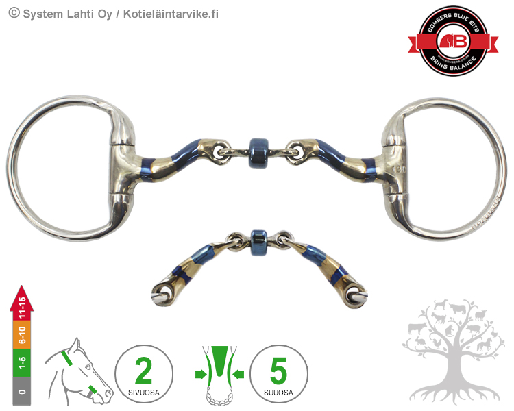 SIVUOSA - Bridong Eggbutt on pienirenkainen (bridong) ja kiinteä (eggbutt, oliivirengas) kuolainrengas, jota yleisemmin käytetään yhdessä kankikuolainten kanssa. Kiinteä kuolainrengas vapauttaa suuosan ohjastuntumalta hitaammin kuin vapaasti pyörivä kuolainrengas (Loose Ring), joten se tehostaa kuolaimen suuosan vaikutusta ja aiheuttaa hieman hevosen niskaan (poll) kohdistuvaa painetta/vipuvaikutusta. Lisäksi kiinteällä kuolainrenkaalla on myös sivuittaissuuntaista (cheek) ohjaavaa vaikutusta. Kuolaimen muotoilu estää kuolainrengasta työntymästä hevosen suuhun ja nipistämästä hevosen suupieliä. Kuolainrenkaan koko on noin 57x50mm (korkeus x leveys) pituuksille 90-115mm ja noin 67x63mm pituuksille 120-160mm. Kuolainrenkaan kokoa voi halutessaan vaihtaa pituuksille 90-115mm koosta 57x50mm kokoon 67x63mm, mutta siitä tulee ilmoittaa tilauksen yhteydessä erikseen.