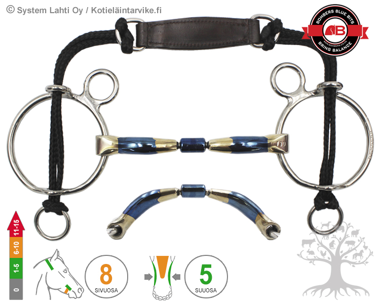 Bombers Curb Gag Barrel 20. Barrel 20 on kaarevaan muotoon muotoiltu 3-palakuolain, jonka keskipalasta lähtevät sivuosat kääntyvät portaattomasti eri suuntiin ohjasapujen mukaisesti. Portaattomasti ja toisistaan riippumattomasti kääntyvät sivunivelet aiheuttavat kieleen ja hammaslomaan enemmän painetta, kun ratsastaja nostaa tai laskee kättään eli ns. muuttaa ohjaskulmaa toispuoleisesti tai yhtä aikaa. Keskiosan pyörivä 20mm pitkä holkki (barrel) aiheuttaa kielelle painetta, joten sillä on hevosen päätä laskeva ja leukaa kohti rintaan päin ohjaava vaikutus. Kuolaimen suuosa on valmistettu Bombersin kehittämästä, ainutlaatuisesta ja erittäin hyvin sylkeä stimuloivasta makeasta raudasta eli "Sweet Iron" -metalliseoksesta.