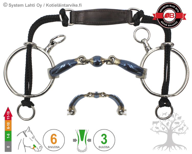 Bombers Curb Gag LR Elliptical Ultra Comfy Lock Up. Elliptical Ultra Comfy Lock Up on uusi innovatiivinen ja uniikki kahteen suuntaan (eteen- ja ylöspäin) lukittuva 3-palakuolain, jolla on hevosta kuolaintuntumalle erittäin rohkaiseva ja palkitseva vaikutus. Tämä anatomisesti huippuunsa suunniteltu ja muotoiltu kuolain myötäilee hevosen suun muotoja lähes “täydellisesti” ja jakaen kieleen ja hammaslomaan kohdistuvan paineen erittäin tasaisesti. Keskiosaan päin nousevat sivunivelet (kielentilamuotoilu) antavat hyvin tilaa myös kielelle, joten kuolain sopii myös kielestään herkille hevosille. Kahteen suuntaan lukittuva 3-palakuolain estää kuolainta aiheuttamasta hevosen kitalakeen kohdistuvaa pistemäistä painetta sekä hammaslomiin kohdistuvaa puristusta eli ns. pähkinänsärkijäefektiä.
