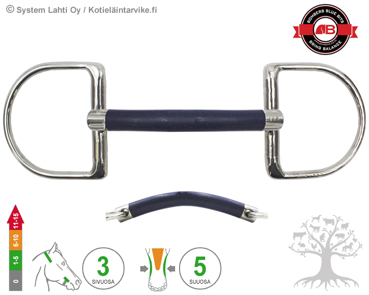 Bombers D-ring Bomber Blue Mullen. Bomber Blue Mullen on valmistettu ainutlaatuisesta, kevyestä ja lämpimän tuntuisesta sekä erittäin hyvin sylkeä/limaa stimuloivasta nailonkomposiitista (sisällä on teräsvahvike). Kuolaimen ainutlaatuinen materiaali sopii erityisesti hevosille, jotka vastustavat metallista valmistettuja kuolaimia mm. pelaamalla kuolaimella ja/tai olemalla suustaan hyvin levottomia. Loivaan kaareen muotoillun Bomber Blue Mullen kuolaimen vaikutukset kohdistuvat tasaisesti koko suun alueelle ja erityisesti hevosen kielelle. Kieleen kohdistuvalla paineella on hevosen päätä laskeva vaikutus. Mullen on vaikutuksiltaan vahva kuolain, joten se ei sovellu nuorille hevosille eikä kokemattomille ratsastajille. Bomber Blue Mullen on materiaalinsa vuoksi pehmeämpi vaihtoehto kuin vastaava Sweet Ironista valmistettu Mullen. Kuolaimissa on mukana Bombersille tunnusomaiset oranssit väriset kuolaintutit, jotka voi halutessaan ottaa pois.