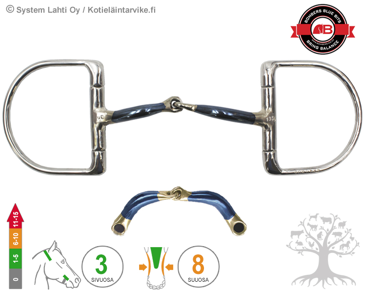SIVUOSA - D-ring on kiinteä D-renkaan muotoinen kuolainrengas, joka tunnetaan myös nimellä Dee. Kiinteä kuolainrengas vapauttaa suuosan ohjastuntumalta hitaammin kuin vapaasti pyörivä kuolainrengas (Loose Ring), joten se tehostaa kuolaimen suuosan vaikutusta ja aiheuttaa hieman hevosen niskaan (poll) kohdistuvaa painetta/vipuvaikutusta. D-renkaan suorat reunat asettuvat tasaisesti hevosen suupieliä/poskia vasten ja antaa vakaamman kuolaintuntuman sekä ehkäisee kuolainrengasta nipistämästä hevosen suupieliä. Lisäksi kiinteillä ja korkeilla D-renkaan muotoilulla on myös sivuittaissuuntaista (cheek) ohjaavaa vaikutusta. Sopii erityisesti nuorille ja suupielistään herkille hevosille. Kuolainrenkaan koko on noin 66x68mm (korkeus x leveys) pituuksille 90-115mm ja noin 92x82mm pituuksille 120-160mm