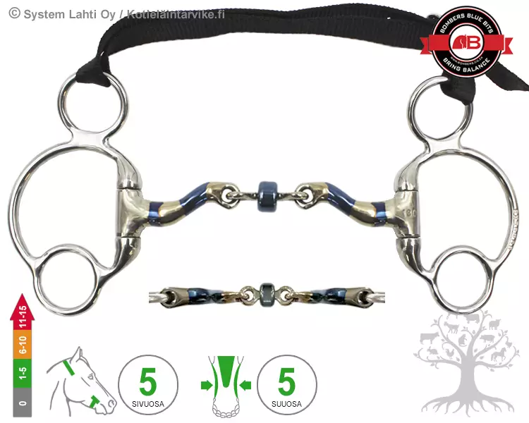 SIVUOSA - Eggbutt 2½ Ring on kiinteä monirenkainen kuolainrengas, jossa on ylä- ja alapuoliset "lisärenkaat" sekä leukahihna. Ylimmistä renkaista kuolain kiinnitetään poskihihnoihin ja keski- ja/tai alarenkaisiin kiinnitetään yhdet tai kahdet ohjat tarpeen mukaan. Kuolaimen vipuvaikutus määräytyy sen mukaan, mihin renkaisiin ohjat kiinnitetään, isoimmissa renkaissa kuolaimen vipuvaikutus on pehmein ja alimmissa renkaissa voimakkain. Kuolaimen ylimmissä renkaissa on leukahihna, jolla säädetään kuolaimen vipuvaikutusta sekä alaleukaan kohdistuvaa painetta. Leukahihna säädetään niin, että kuolaimen vipukulma on noin 45° kulmassa (älä kiristä liian tiukalle). Kiinteässä kuolainrenkaassa ratsastajan ohjasavut siirtyvät ja vapautuvat vapaasti pyörivää kuolainrengasta huomattavasti hitaammin, joten se tehostaa hieman kuolaimen suuosan vaikutuksia. Lisäksi 2½ -renkaisessa sivuosassa on myös sivuittaissuuntaista (cheek) ohjaavaa vaikutusta. Kiinteä kuolainrengas asettuu tasaisesti hevosen suupieliä/poskia vasten ja antaa vakaamman kuolaintuntuman sekä ehkäisee kuolainrengasta nipistämästä hevosen suupieliä. Eggbutt 2½ -renkainen on todella monipuolinen kuolainrengas ja sen vipuvaikutuksia voidaan säätää helposti ja nopeasti tarpeen ja tilanteen mukaan. Sisältää säädettävän nylonisen leukahihnat, jossa on kätevä nepparikiinnitys.