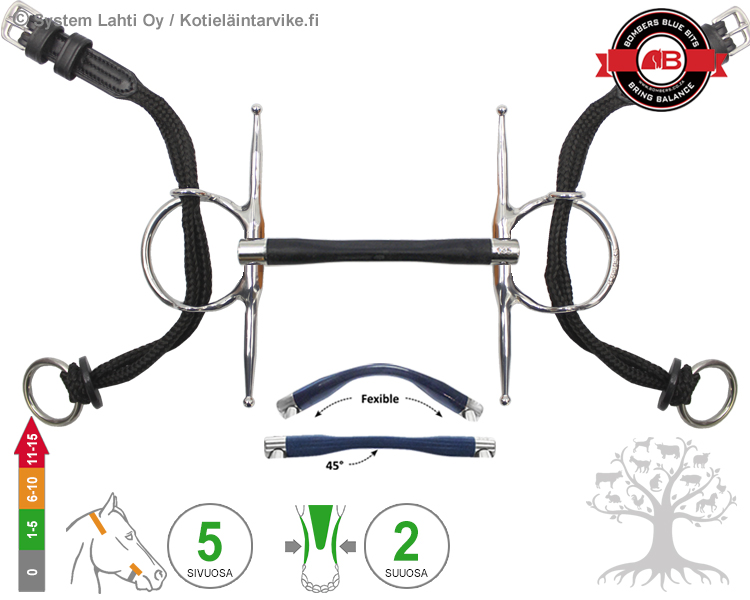 SIVUOSA - Full Cheek Gag on kiinteä varrellinen kuolainrengas, jonka ylä- ja alapuolisten "lisärenkaiden" läpi kulkee nailonista valmistetut gag -remmit. Gag-remmien yläpuoliset solkipäät kiinnitetään poskihihnoihin ja alapuoliset renkaat ohjiin. Ohjastuntuman mukaan gag -ohjien vipuvaikutus tehostaa suuosan vaikutuksia, venyttää suupieliä ja nostaa suuosaa sekä aiheuttaa painetta erityisesti niskaan (poll) ja suupieliin/poskiin (cheek). Useimmat hevoset reagoivat suupieliä venyttäviin ja kuolaimen suuosaa nostaviin kuolaimiin kääntämällä/ravistelemalla päätään, jolloin ne valitettavasti menettävät tasapainonsa. Tästä syystä gag-kuolaimen käyttöä tulisi kyseenalaistaa. Kiinteä varrellinen kuolainrengas asettuu tasaisesti hevosen suupieliä/poskia vasten ja antaa vakaamman kuolaintuntuman sekä ehkäisee kuolainrengasta nipistämästä hevosen suupieliä. Varrellisella kuolainrenkaalla on erityisesti sivuittaissuuntaista (cheek) ohjaavaa vaikutusta, joten se sopii hevosille, jotka tarvitsevat kääntämistä helpottavia apuja. Kiinteässä kuolainrenkaassa ratsastajan ohjasavut siirtyvät ja vapautuvat vapaasti pyörivää kuolainrengasta huomattavasti hitaammin, joten se tehostaa kuolaimen suuosan vaikutuksia. Gagi -kuolainta käytetään hevosen hallittavuuden parantamiseen mm. hevosille, jotka nostavat päätään liian ylös ohjastuntuman "yläpuolelle" sekä hevosille, joilla on taipumusta painaa kuolainta tai ohjastuntumaa vasten. Gag -kuolainta suositellaan käytettävän myös kaksin ohjin, toiset ohjat kiinnitetään isoimpiin kuolainrenkaisiin ja toiset gag -renkaisiin, näin gag -ohjien voimakkaampaa vipuvaikutusta voidaan käyttää vain tarvittaessa. Gag -kuolaimessa on mukana helposti ja nopeasti liukuvat nailonista valmistetut gag -remmit. Kuolainrenkaan halkaisija Ø72mm ja varren kokonaiskorkeus 160mm. Full Cheek varsikuolaimen kanssa suositellaan käytettävän ylävarren stoppareita/kiinnityslenkkejä, joiden avulla kuolainvarsi pysyy paremmin paikoillaan ja "oikeassa" asennossa.