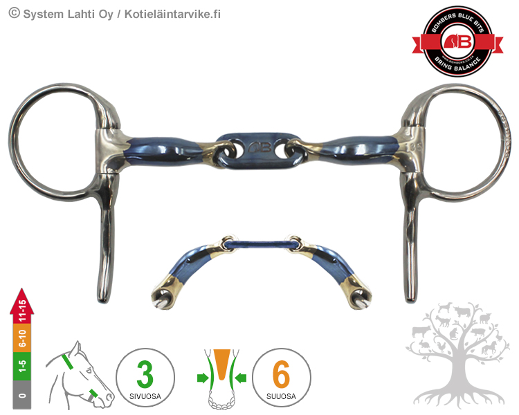 Bombers Half Spoon Control Plate 45°. Control Plate 45° kuolaimessa on litteä/laattamainen "plate" ja 45mm pitkä keskipala, joka on suuosassa kiinni kielensuuntaisesti 45° kulmassa. Kuolaintuntumalla kuolain on vaikutuksiltaan pehmeä antaen tilaa hevosen kielelle ja jakaen kuolaimen aiheuttaman paineen tasaisesti laajemmalle alueelle. Jos hevonen laskee päätään/leukaa liian alas tai liian ylös, niin kuolaimen laattamainen keskipala “kääntyy” ja aiheuttaa painetta hevosen kielelle ohjaten sitä takaisin kuolain-/ohjastuntumalle. Control Plate on ns. “kontrollikuolain", joka parantaa hevosen hallittavuutta. Kuolaimen suuosa on valmistettu Bombersin kehittämästä, ainutlaatuisesta ja erittäin hyvin sylkeä stimuloivasta makeasta raudasta eli "Sweet Iron" -metalliseoksesta. Erittäin suosittu kuolain!