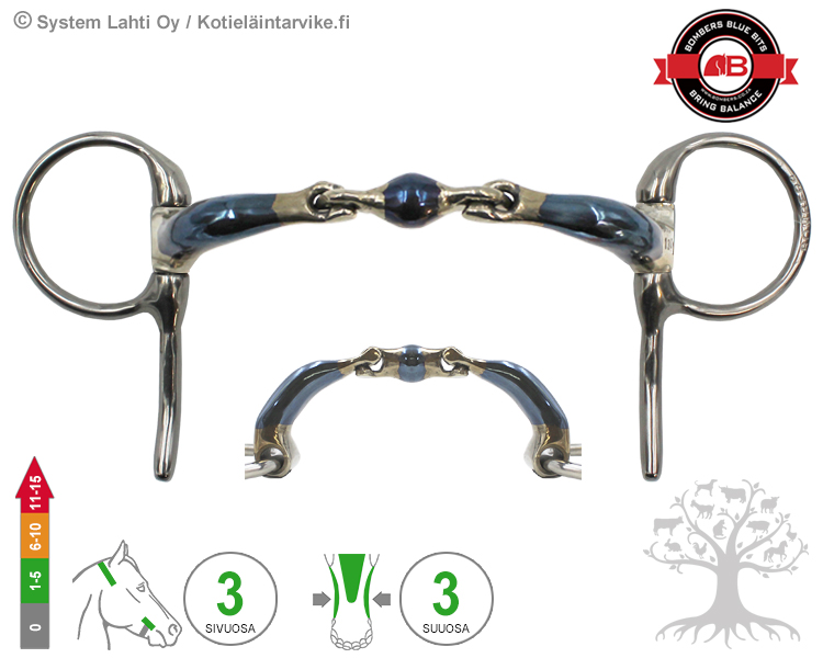 Bombers Half Spoon Elliptical Ultra Comfy Lock Up. Elliptical Ultra Comfy Lock Up on uusi innovatiivinen ja uniikki kahteen suuntaan (eteen- ja ylöspäin) lukittuva 3-palakuolain, jolla on hevosta kuolaintuntumalle erittäin rohkaiseva ja palkitseva vaikutus. Tämä anatomisesti huippuunsa suunniteltu ja muotoiltu kuolain myötäilee hevosen suun muotoja lähes “täydellisesti” ja jakaen kieleen ja hammaslomaan kohdistuvan paineen erittäin tasaisesti. Keskiosaan päin nousevat sivunivelet (kielentilamuotoilu) antavat hyvin tilaa myös kielelle, joten kuolain sopii myös kielestään herkille hevosille. Kahteen suuntaan lukittuva 3-palakuolain estää kuolainta aiheuttamasta hevosen kitalakeen kohdistuvaa pistemäistä painetta sekä hammaslomiin kohdistuvaa puristusta eli ns. pähkinänsärkijäefektiä.