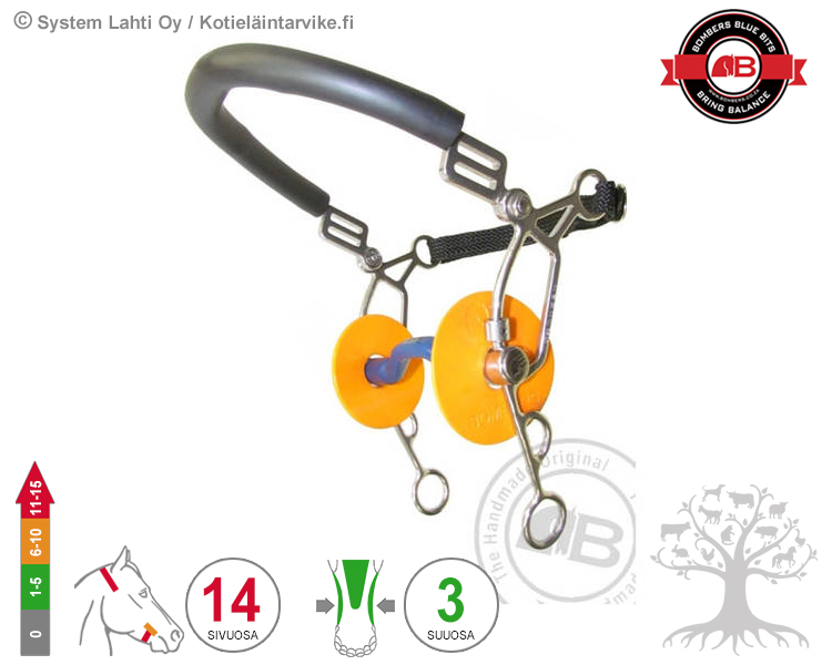 Bombers Hybrid Bomber Blue. Bomber Blue on uniikki kielentilallinen kuolain, joka valmistettu ainutlaatuisesta, kevyestä ja lämpimän tuntuisesta sekä erittäin hyvin sylkeä/limaa stimuloivasta nailonkomposiitista (sisällä on teräsvahvike). Kuolaimen ainutlaatuinen materiaali sopii erityisesti hevosille, jotka vastustavat metallista valmistettuja kuolaimia mm. pelaamalla kuolaimella ja/tai olemalla suustaan hyvin levottomia. Bomber Blue sopii hämmästyttävän hyvin erityyppisille hevosille lajista riippumatta. Kuolaimissa on mukana Bombersille tunnusomaiset oranssit väriset kuolaintutit, jotka voi halutessaan ottaa pois.