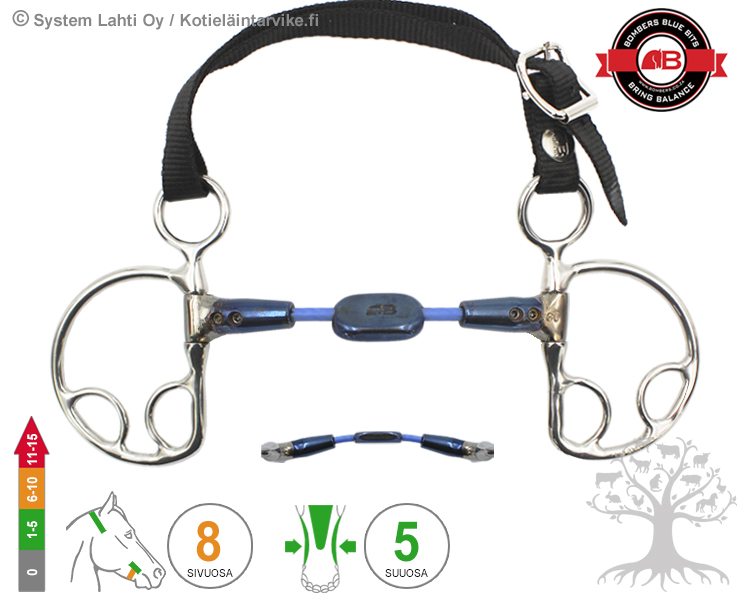 SIVUOSA - Kimblewick Lite on kiinteä vipuvarrellinen kuolain, jossa on ylä- ja alapuolisia "lisärenkaita" sekä nailoninen leukahihna. Kimblewick Lite on ylävarrestaan lyhyempi kuin yleisemmin käytetty Kimblewick ja siten myös vipuvaikutuksiltaan paljon pehmeämpi ja suositeltavampi vaihtoehto "less is best". Kimblewick- kuolaimen vipuvaikutuksen voimakkuus riippuu siitä, mihin renkaaseen ohjat ovat kiinnitettyinä; isoimmissa kuolainrenkaissa kuolaimen vipuvaikutus on pehmein, keskimmäisissä keskikova ja alimmissa voimakkain. Isoimmissa kuolainrenkaissa ohjat pääsevät liukumaan alas-ylöspäin ratsastajan nostaessa tai laskiessa käsiään, joten ratsastaja voi täten vaikuttaa suuosan kulmaan ja tehostaa/pehmentää hetkellisesti kuolaimen vaikutuksia. Kuolaimen vipuvarsi aiheuttaa ratsastajan ohjastuntuman mukaan painetta alaleukaan (curb) sekä keskikovaa painetta poskiin (cheek) ja niskaan (poll). Ohjastuntuma tehostaa myös kuolaimen suuosan vaikutuksia, joten kuolaimen suuosa tulee olla hevoselle miellyttävä. Kuolaimen vipuvarsi asettuu tasaisesti hevosen suupieliä/poskia vasten ja antaa vakaan kuolaintuntuman hevosen suuhun ja lisää sivuttaissuuntaista (cheek) ohjaavaa vaikutusta. Ylimmistä varsirenkaista kuolain kiinnitetään poskihihnoihin. Leukahihna säädetään niin, että kuolaimen vipukulma on noin 45 asteen kulmassa (älä kiristä leukaketjua liian tiukalle). Kiinteässä vipuvarrellisessa kuolaimessa ratsastajan ohjasavut siirtyvät ja vapautuvat erittäin hitaasti, joten se voi olla erityisen herkille ja "nopeille" hevosille hieman liiankin hidas toimien lähes jatkuvana ”käsijarruna”. Kimblewick -kuolainta käytetään Pelham -kuolaimen tavoin hevosen hallittavuuden parantamiseen mm. vahvoilla ja vaikeasti hallittavilla sekä helposti kuumentuvilla hevosilla. Kuolainrenkaan koko on noin 120x70mm (korkeus x leveys) ja ylävarren korkeus suuosan yläreunasta 47mm. Huom! Kimblewick on vaikutuksiltaan vahva vipukuolain, joten se soveltuu vain kokeneille ratsastajille!