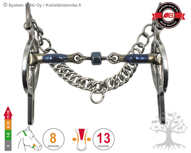 SIVUOSA - Liverpool LR on kiinteä vipuvarrellinen valjakko ajokuolain, jonka suuosa ja sivuosa on kiinteästi yhdessä, mutta kuolaimen vipuvarsi pääsee kääntymään (Rotate) ”pystysuuntaisesti” ohjasapujen suuntaisesti/mukaisesti. Poskihihnoihin kiinnitettävät ylärenkaat pääsevät pyörimään täysin vapaasti (LR = Loose Ring), jolla on haluttu vähentää niskaan ja leukaan kohdistuvaa painetta. Kuolaimen vipuvaikutus niskaan ja alaleukaan määräytyy sen mukaan, mihin ohjaspaikkoihin (A-C/D) ohjat kiinnitetään, isoimmissa renkaissa (A) kuolaimen vipuvaikutus on pehmein ja alimmissa renkaissa (C/D) voimakkain. Kuolaimen vipuvarsi asettuu tasaisesti hevosen suupieliä/poskia vasten ja antaa vakaan kuolaintuntuman hevosen suuhun ja lisää sivuttaissuuntaista (cheek) ohjaavaa vaikutusta. Leukaketju säädetään niin, että kuolaimen vipukulma on noin 45 asteen kulmassa (älä kiristä leukaketjua liian tiukalle). Kuolaimessa on mukana ruostumattomasta teräksestä valmistetut leukaketju ja -ketjun kiinnityskoukut. Saatavana kahta eri varren pituutta: Short 2 -ohjaspaikkaa (B-C) ja Long 3-ohjaspaikkaa (B-D). Ajokuolain tulisi mitoittaa hevoselle mahdollisimman napakasti/stabiilisti, ettei kuolaimen suuosa pääsisi liikkumaan sivuttaissuuntaisesti.
